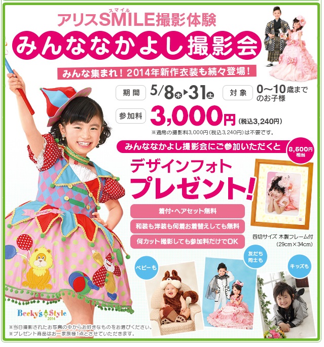スタジオ アリス なかよし 撮影 会 2016. 長女しめもついに2才! と、言うことで、今年も恒例のスタジオアリスへ記念撮影に行ってきました。 その様子をお伝えします! ※今回使用している写真は全て動画のキャプチャーとなります。 予約は午前中がやっぱりねらい目。日曜日の10時から 約1ヶ月前の12月上旬に予約をしました。. スタジオマリオtop > 赤ちゃん写真展 「赤ちゃん撮影会キャンペーン」に参加していただいた方のお写真を展示しています。 お名前・都道府県・ご注文日から検索できます。. スタジオアリスの、みんなでなかよし撮影会はアリスでの撮影が初めての方が対象ですか? 明後日にアリスで2回目の撮影で予約を入れる予定でしたが、なかよし撮影会があるならば来週にしようかな?と思いますが… 「みんななかよし撮影会」は、過去の利用経験は問いません。初めてでなく.