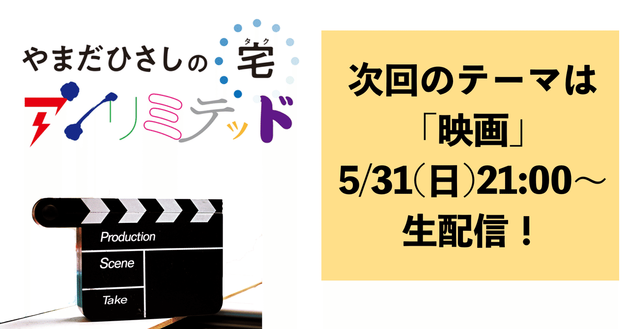 次回のテーマは 映画 5 31 日 生配信 やまだひさしのタク 宅 アンリミテッド 3 Radio 9 リモート時代の 顔見せ系 ラジオ Note