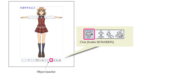 下一篇: qumarion×clip studio paint 創作過程Ⅳ. Qumarion×clip studio paint メイキング. On the Object launcher, click Enable QUMARION for the QUMARION to operate.